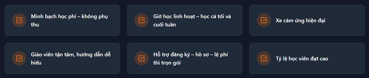 Với đội ngũ giáo viên tận tâm – xe học cảm ứng – giờ học linh hoạt, học viên được hướng dẫn kỹ lưỡng từ lý thuyết đến thực hành, đảm bảo vững tay lái trước khi thi.
