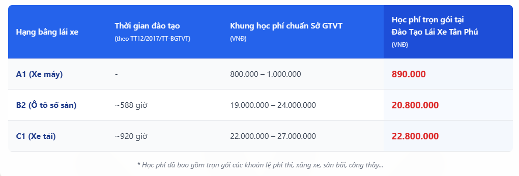 💬 “Học phí được xây dựng theo khung chuẩn Sở GTVT TP.HCM, đã bao gồm toàn bộ chi phí đào tạo, hồ sơ và lệ phí thi — học viên không phải đóng thêm bất kỳ khoản nào khác. Không cắt giảm giờ tập, không cắt giảm giờ học.”
